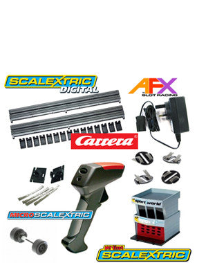 Accesorios Scalextric usados. Trenzas, controladores, edificios, adaptadores de corriente, Stands, Fronteras y barreras.